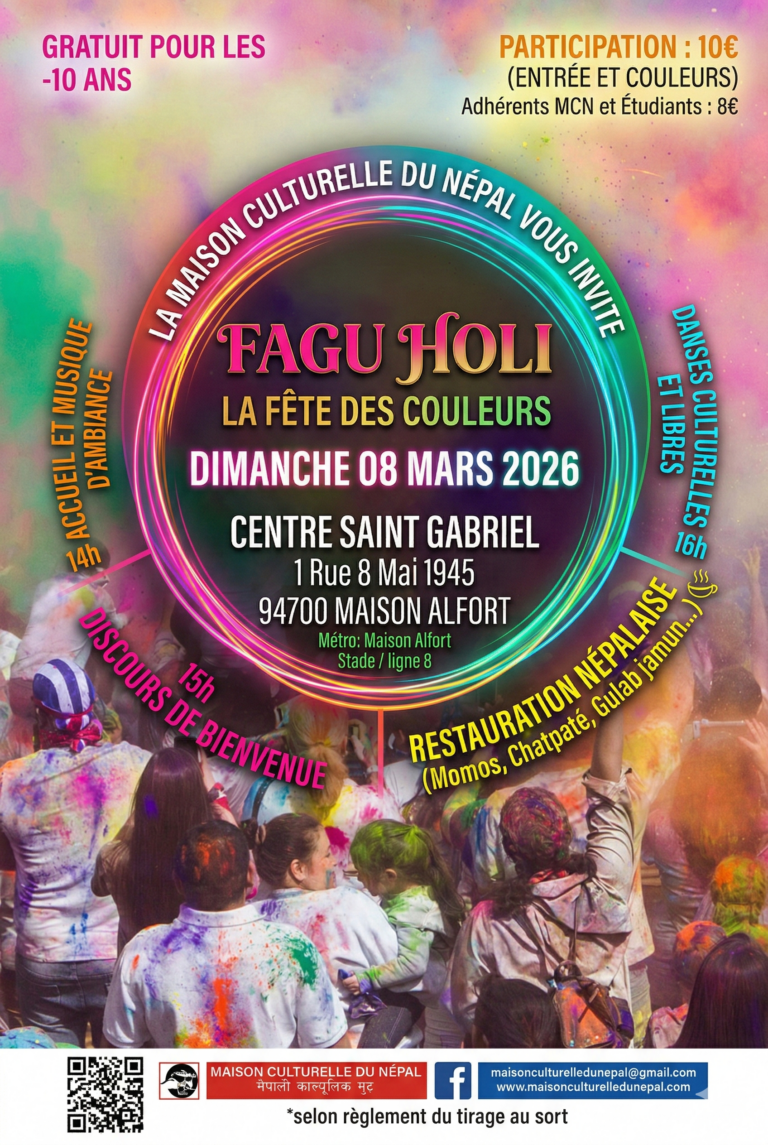 Vous pourrez y retrouver de la musique d’ambiance dès 14h, suivie du discours de bienvenue à 15h, ainsi que des danses culturelles et libres pour célébrer Holi à 16h. Des spécialités culinaires népalaises comme des momos et des gulab jamun seront également proposées à l’heure du thé.